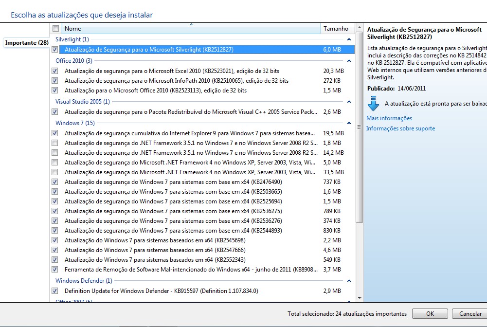Na imagem acima é possível ter todas as atualizações de uma forma detalhada, marque as que forem necessárias e clique em Ok.