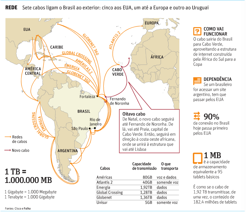 jul 6, 2011Hoje boa parte da transmissão de dados entre os países é feita através de cabos submarinos.O Brasil planeja a construção de um novo cabo submarino para tráfego de dados até a Europa e a África, cruzando o Atlântico. Hoje, mais de 90% da conexão de internet no país passa pelos Estados Unidos, e escapar dessa dependência é o objetivo do governo. A estratégia será construir o cabo para a Copa de 2014, como fez a África do Sul quando sediou o mundial de futebol em 2010, com um cabo que percorre toda a costa oeste do continente até Portugal.