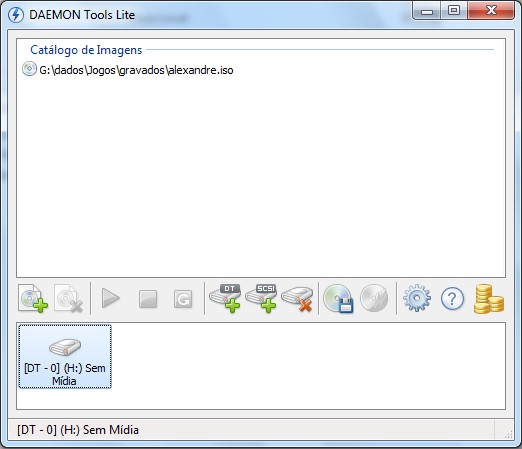 3. Ao acessar o programa ele irá exibir uma tela onde são informadas as unidades virtuais e imagens de CD/DVD utilizadas, se for a primeira vez que você acessa o programa, ele irá exibir apenas uma unidade virtual, que é criada por padrão, na imagem abaixo foi criada a unidade H:.