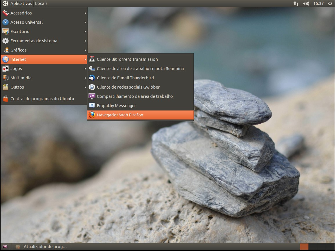 Vamos conhecer alguns programas que já vem instalado com o Ubuntu, clique no menu Aplicativos (na parte superior esquerda), vá na opção Internet, nela temos alguns aplicativos como o navegador Firefox, o gerenciador de e-mails Thunderbird (similar ao Outlook), o Empathy Messenger (mensageiro instantâneo para MSN e redes sociais), o Transmission (para torrent), entre outros.