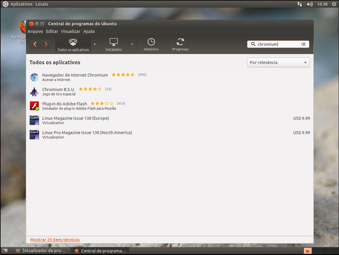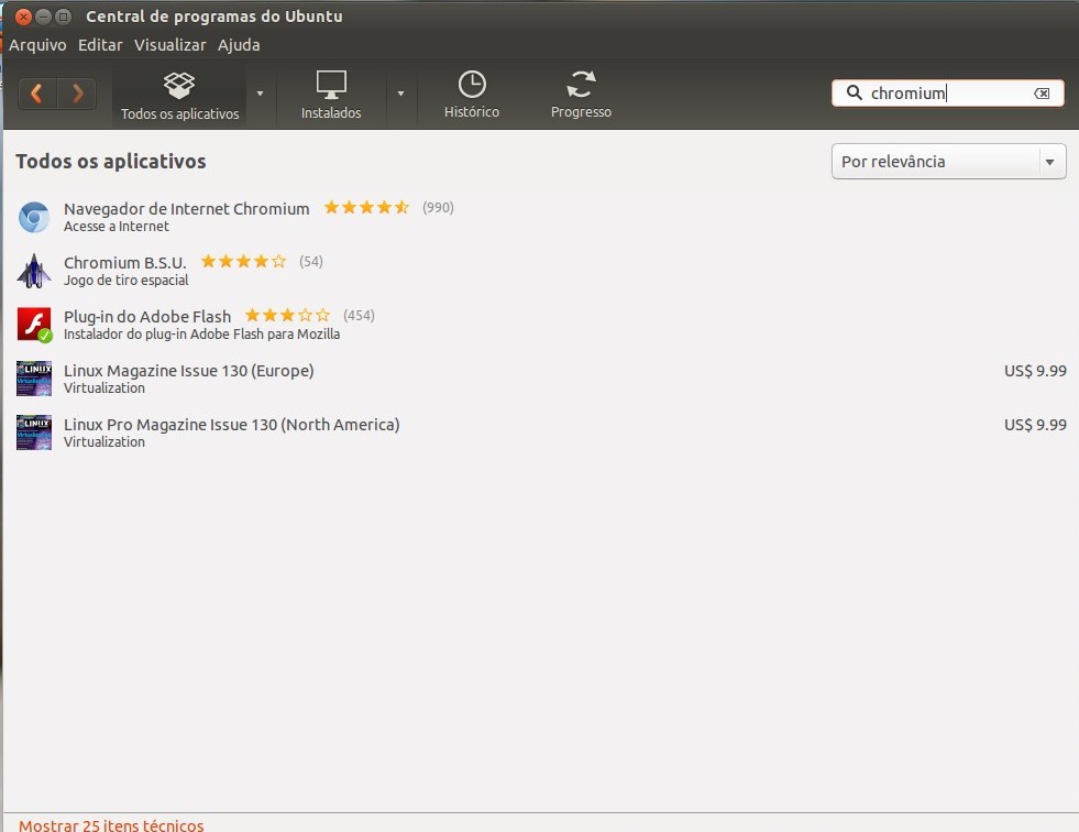 No canto direito superior da janela, digite na caixa de busca a palavra Chromium, automaticamente serão listados os resultados, clique no resultado “Navegador de internet Chromium” e depois no botão “Instalar” que surgiu do lado direito do final da linha. Será necessário fornecer sua senha, aguarde o final da instalação. E acesse o Chromium pelo menu Aplicativos/Internet. Note que é praticamente o mesmo visual de sua versão para Windows.