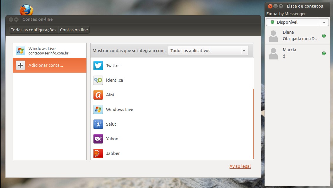 Para mensagens instantâneas, usaremos o programa “Empathy Messenger”, seu uso é bem simples, basta adicionar uma nova conta (MSN, Facebook e outros), para já começar a se comunicar com seus contatos.