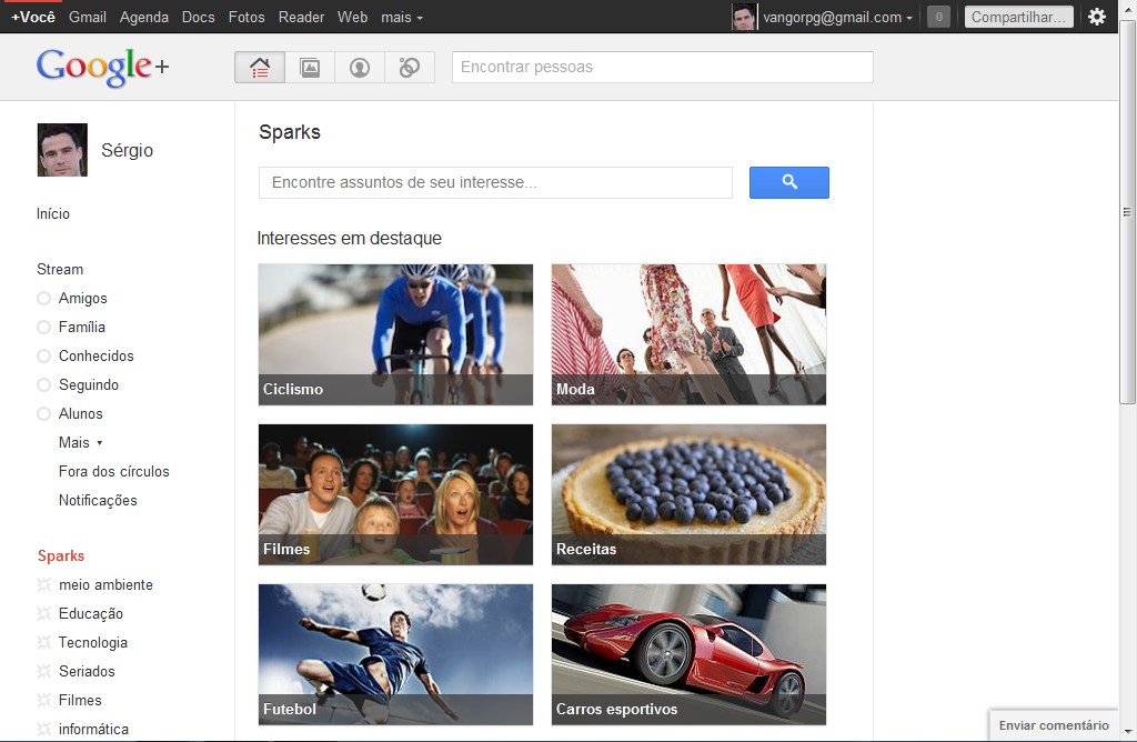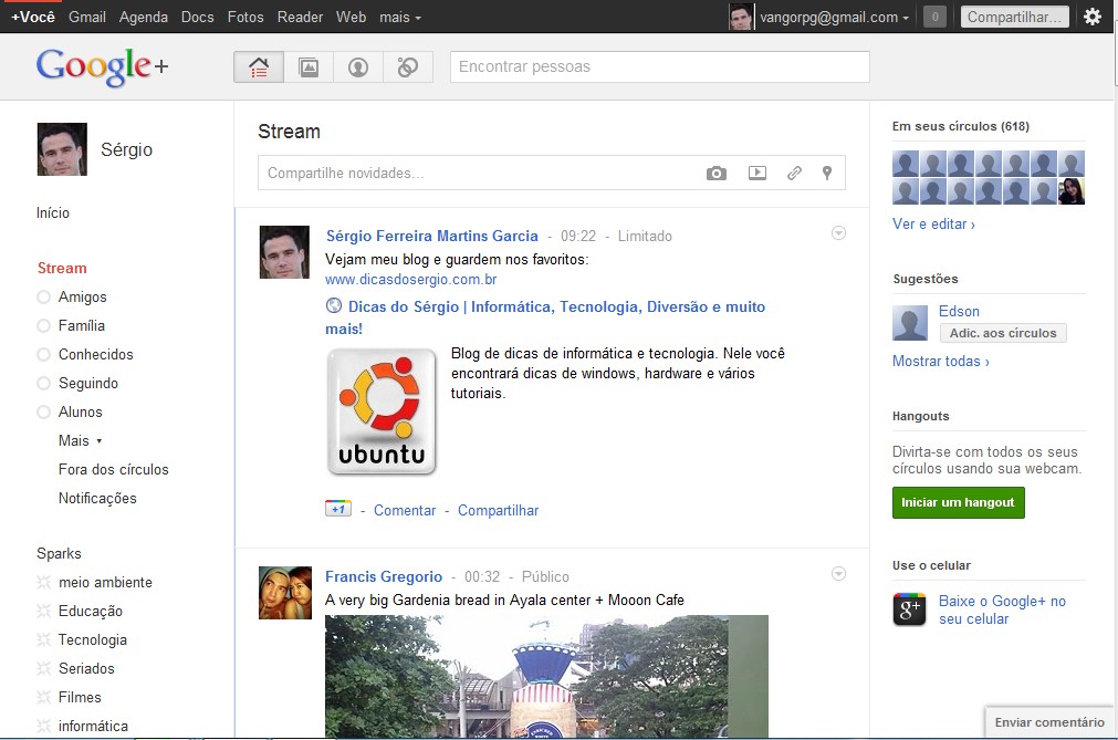 O stream que é bem parecido com o feed do Facebook não poderia faltar, nele você fica por dentro de todas as novidades que são lançadas no seu círculo de amizade. Do lado esquerdo temos os Sparks, que nada mais é do que um feed personalizado com os assuntos que você se interessa, ainda sinto falta das comunidades, igual ao Orkut: